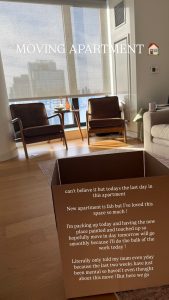 In another update, she said she “can’t believe” it’s her last day in the apartment she has loved so much, but confirmed the new place is “fab.”