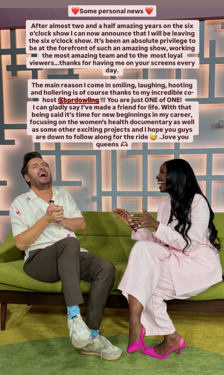 “After almost two and a half amazing years on The Six O’Clock Show I can now announce that I will be leaving The Six O’Clock Show,” she explained.