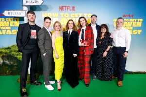 (L to R) Brian J Falconer, Caoilfhionn Dunne, Sinead Keenan, Roisin Gallagher, Lisa McGee, Michael Lennox, Liz Lewin and guest attend the Netflix premiere of ‘How To Get To Heaven from Belfast’ at Queen’s Film Theatre, Belfast, Northern Ireland on February 4th, 2026. (Photo by StillMoving.Net for Netflix)