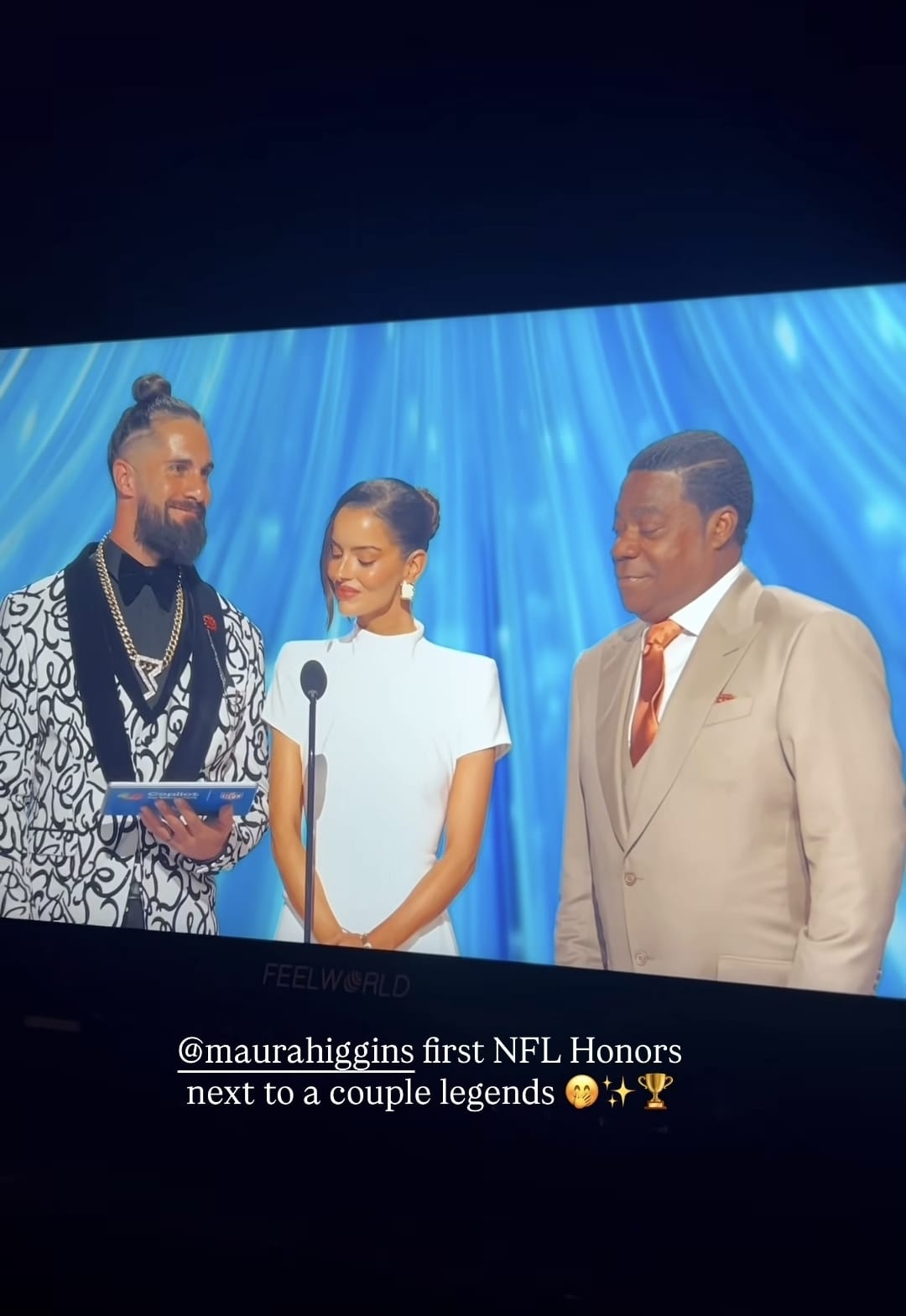 Ahead of the game, which ended 29-13 to the Seahawks, Maura appeared on the stage at the NFL Honours Awards in San Francisco to present the winner of the Best Moment in the sport. She appeared alongside comedian Tracy Morgan and wrestler Seth Rollins.