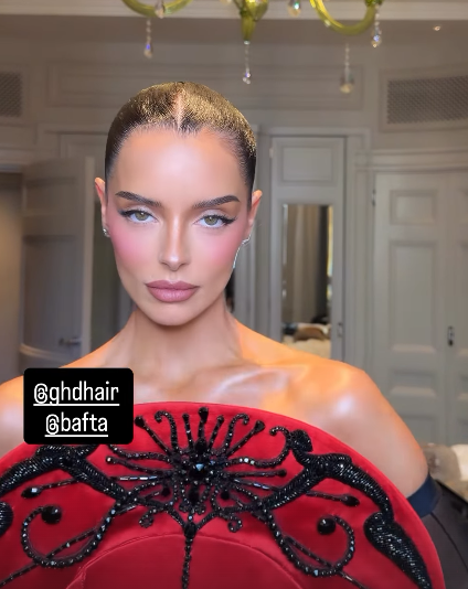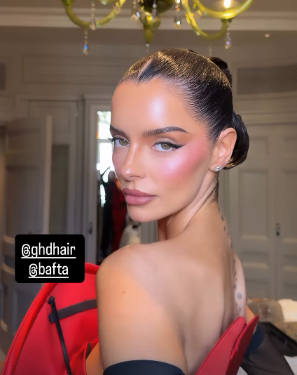 Now she has turned heads at this year’s BAFTAs when she stepped out in a red satin dress with dramatic bead detailing around the structured bodice and a train that covered the carpet.