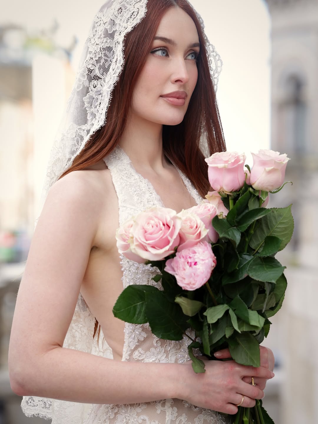 Roz wore a beautiful lace dress with a halter neckline, she added a matching veil as well and a pair of simple shoes. We adore!